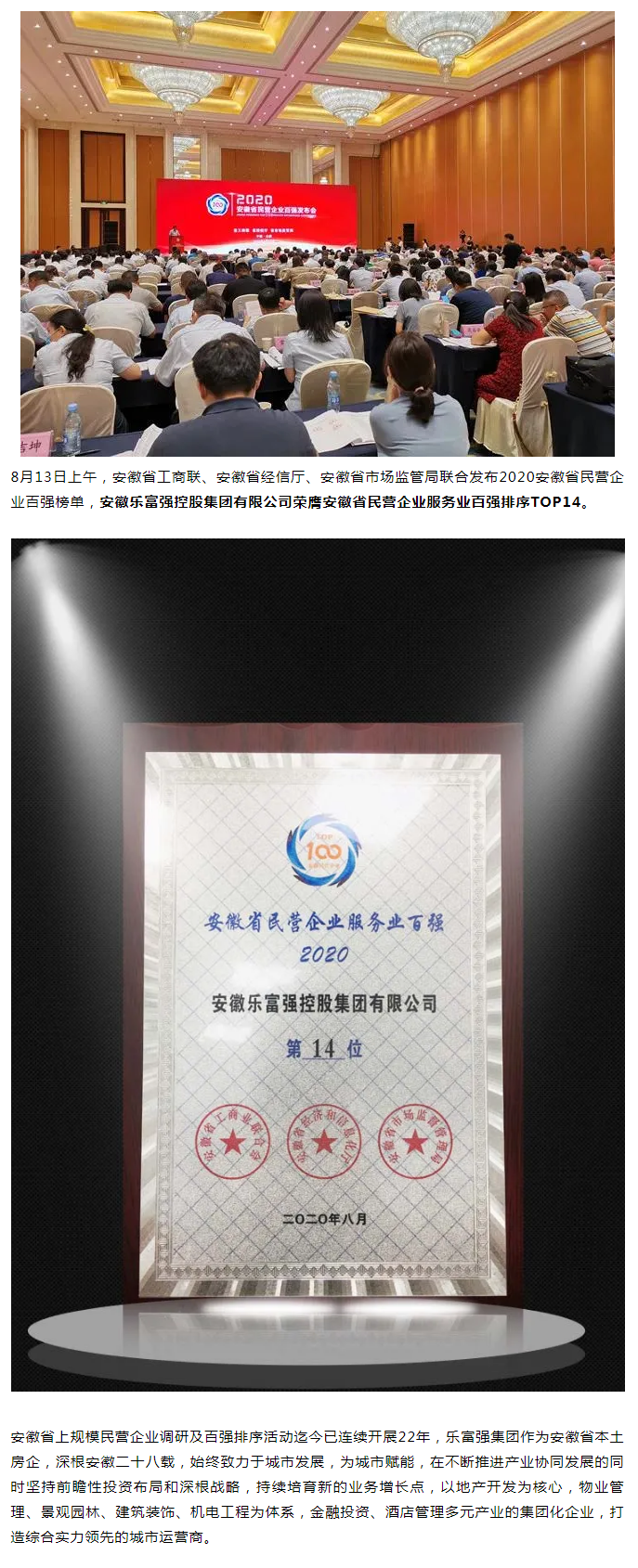 樂富強(qiáng)集團(tuán)榮膺2020安徽省民營企業(yè)服務(wù)業(yè)百強(qiáng)TOP14