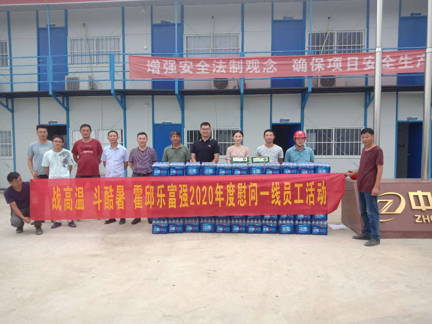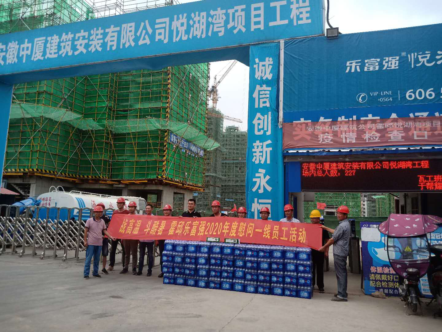 在這連續的“桑拿天”中,有這么一群戶外工作的“逆行者”,他們頂著烈日戴著口罩堅守崗位,為腳下這座城市的正常運行而付出辛勞。在這種天氣下,工程項目上的一線員工的工作和生活情況讓公司領導格外掛心,8月20日,由樂富強地產霍邱公司副總經理宋超、副總經理陳煜等人一行走訪慰問了玖悅府項目、悅湖灣項目施工現場,看望慰問一線堅守的工作人員,送去防暑降溫慰問品及應急藥品,并把公司的關懷送到工人心坎上。