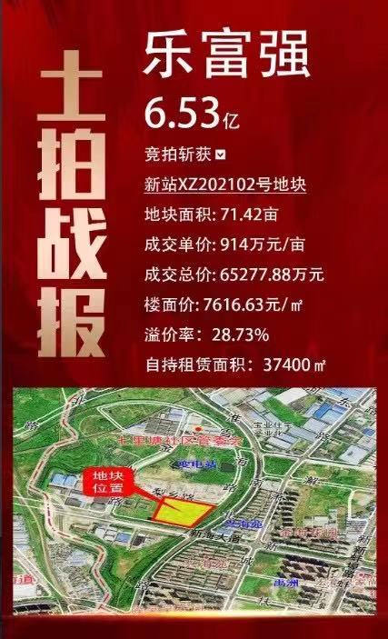 樂富強集團以914萬元/畝競得位于新站高新區規劃梨鄉路以南、春曉路以東的新站高新區XZ202102號地塊,總價65277.88萬元,居住樓面價7616.63元/㎡,溢價率28.73%,競自持面積37400㎡。